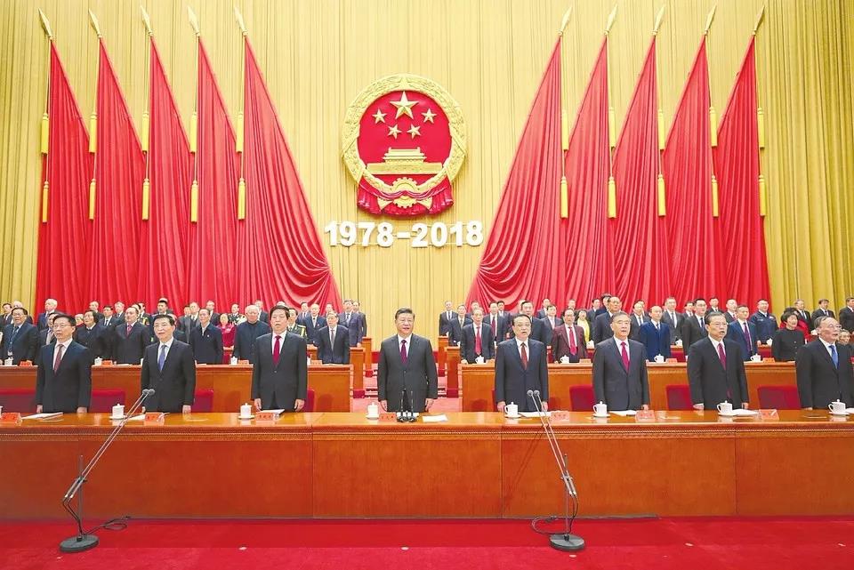 人民大會(huì)堂雄偉莊嚴(yán),萬人大禮堂燈火輝煌、氣氛熱烈。主席臺(tái)上方懸掛著“慶祝改革開放40周年大會(huì)”會(huì)標(biāo),后幕正中是中華人民共和國(guó)國(guó)徽和“1978-2018”字標(biāo),10面紅旗分列兩側(cè)。