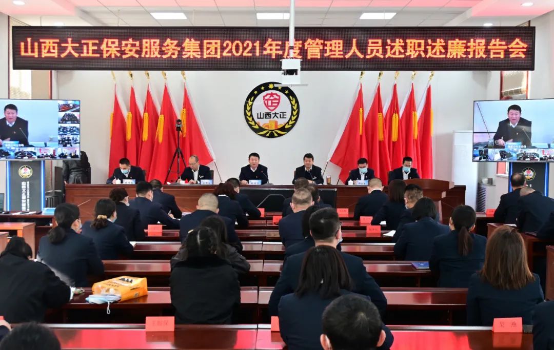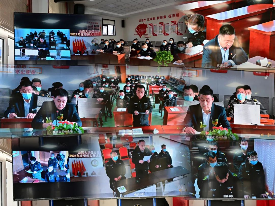 2022年1月8日-9日,山西大正保安服務集團有限公司召開2021年度管理人員述職述廉報告視頻會議,大會主會場設立在總部會議室,黨委副書記、總經(jīng)理趙培宏出席會議并作重要講話,黨委副書記、副總經(jīng)理陳志平主持會議,公司黨政領導班子成員出席會議,各部門負責人及員工代表參會,各分公司、子公司、各縣市基層中隊共計21個分會場以視頻方式參會。