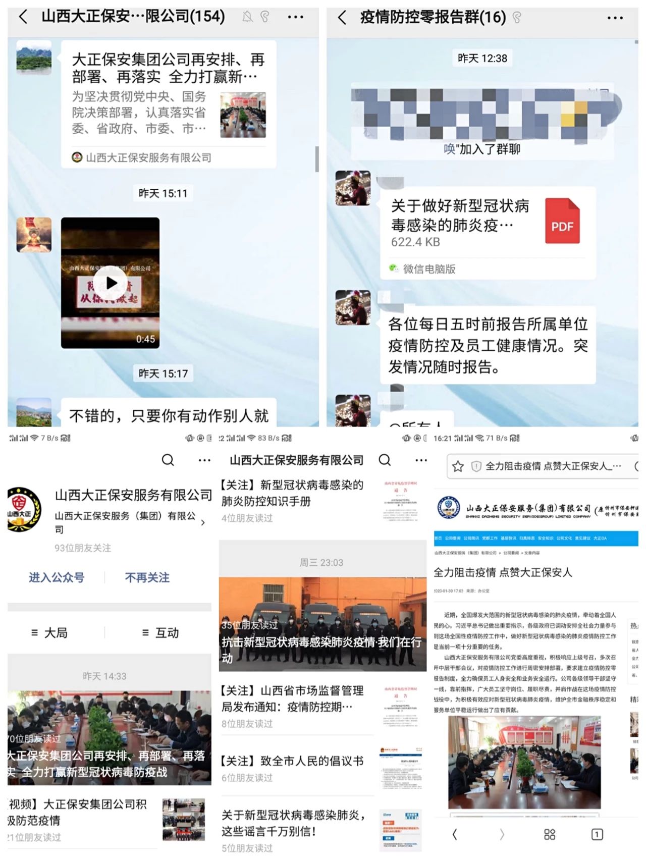 山西大正保安服務(wù)(集團(tuán))有限公司承擔(dān)我市金融行業(yè)從金庫(kù)安全到接送款保障的重要任務(wù),還有我市14個(gè)縣市政府機(jī)關(guān)、醫(yī)療機(jī)構(gòu)、水電氣供應(yīng)等重要單位的安全保衛(wèi),國(guó)有企業(yè)物業(yè)管理項(xiàng)目等,服務(wù)面廣點(diǎn)多,面對(duì)突如其來(lái)的疫情,保障業(yè)務(wù)運(yùn)行、防控疫情責(zé)任重大。為了積極承擔(dān)肩負(fù)的社會(huì)責(zé)任和義務(wù),發(fā)揮國(guó)有安保企業(yè)的應(yīng)有作用,團(tuán)結(jié)帶領(lǐng)廣大黨員干部打贏抗擊疫情戰(zhàn)役,集團(tuán)公司成立了“山西大正保安服務(wù)有限公司新型冠狀病毒疫情防控領(lǐng)導(dǎo)小組”。黨委書(shū)記、董事長(zhǎng)、總經(jīng)理張躍生擔(dān)任組長(zhǎng),公司領(lǐng)導(dǎo)班子成員為副組長(zhǎng),各部門(mén)負(fù)責(zé)人為成員,統(tǒng)一領(lǐng)導(dǎo)全公司疫情防控工作。公司中層以上領(lǐng)導(dǎo)全部取消休假,深入一線(xiàn),靠前指揮,及時(shí)掌握防控工作動(dòng)態(tài),研究決定疫情防控的有關(guān)事項(xiàng),嚴(yán)格落實(shí)各項(xiàng)防控措施。