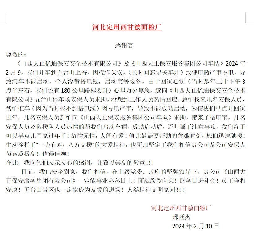 這些看似微不足道的小事,卻讓游客感受到了五臺山不僅有著豐富的文化底蘊(yùn)和美麗的自然風(fēng)光,更有著溫暖人心的服務(wù)。為了表達(dá)對執(zhí)勤隊員無私幫助的感激之情,一位游客特意寫了一封感謝信,贊揚(yáng)他們的專業(yè)和熱心,感謝他們?yōu)橛慰蛶淼谋憷桶残摹?/p>