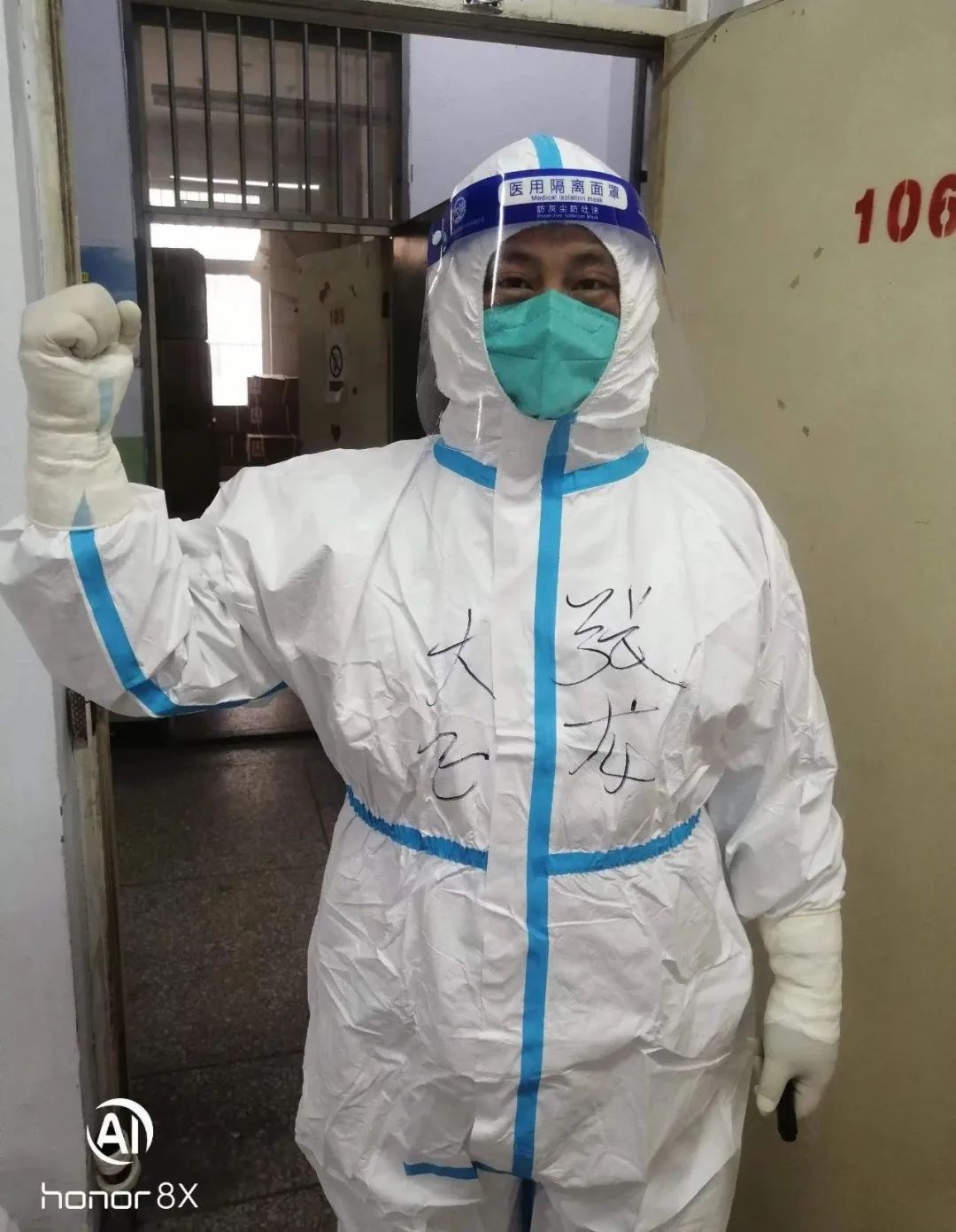 11月16日晚上6點,是他們第一次穿著防護服進入隔離區(qū)為隔離人員高風險近距離服務。關向宇同志身體高大肥胖,穿脫防護服要比常人艱難的多,為盡職責完成任務,自己克服困難,知難而上,跨入隔離區(qū)。二人在隔離區(qū)服務近四個小時,出來時滿身流著汗水,第二天兩人都發(fā)生了身體不適狀況,身體發(fā)冷、咳嗽等癥狀,但是他們沒有畏縮,提振精神,繼續(xù)馬不停蹄的干活,該干啥干啥,該做什做什,忙里又忙外。