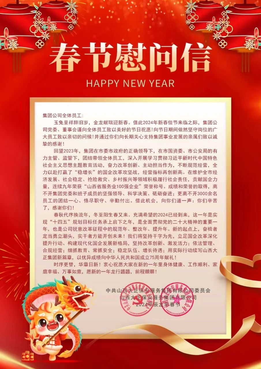 玉兔呈祥辭舊歲,金龍獻(xiàn)瑞迎新春。值此2024年新春佳節(jié)來臨之際,集團(tuán)公司黨委、董事會(huì)謹(jǐn)向全體員工致以美好的節(jié)日祝愿!向節(jié)日期間依然堅(jiān)守崗位的廣大員工致以親切的問候!并通過你們向長(zhǎng)期關(guān)心支持集團(tuán)事業(yè)發(fā)展的親屬們致以誠(chéng)摯的感謝!