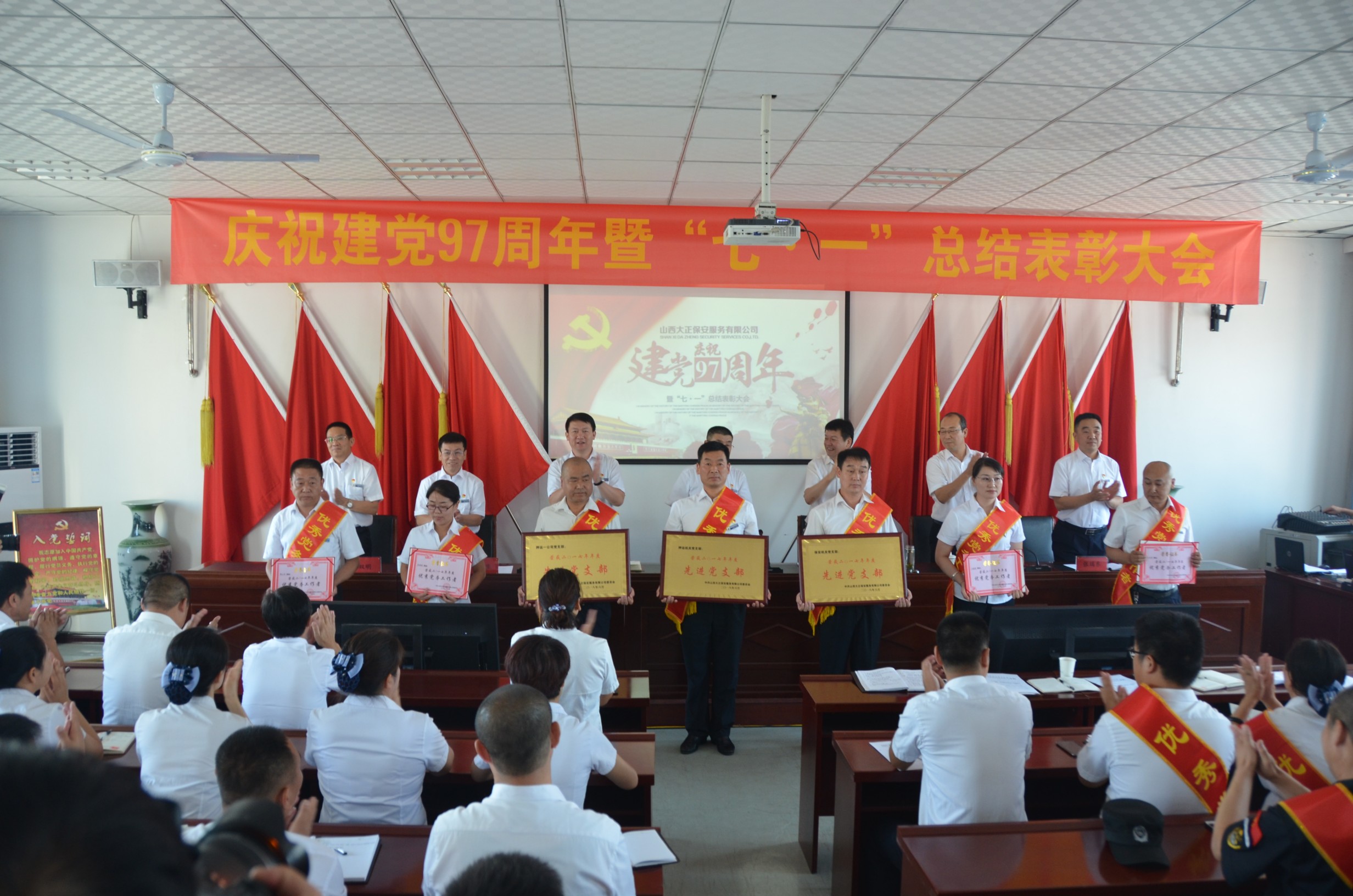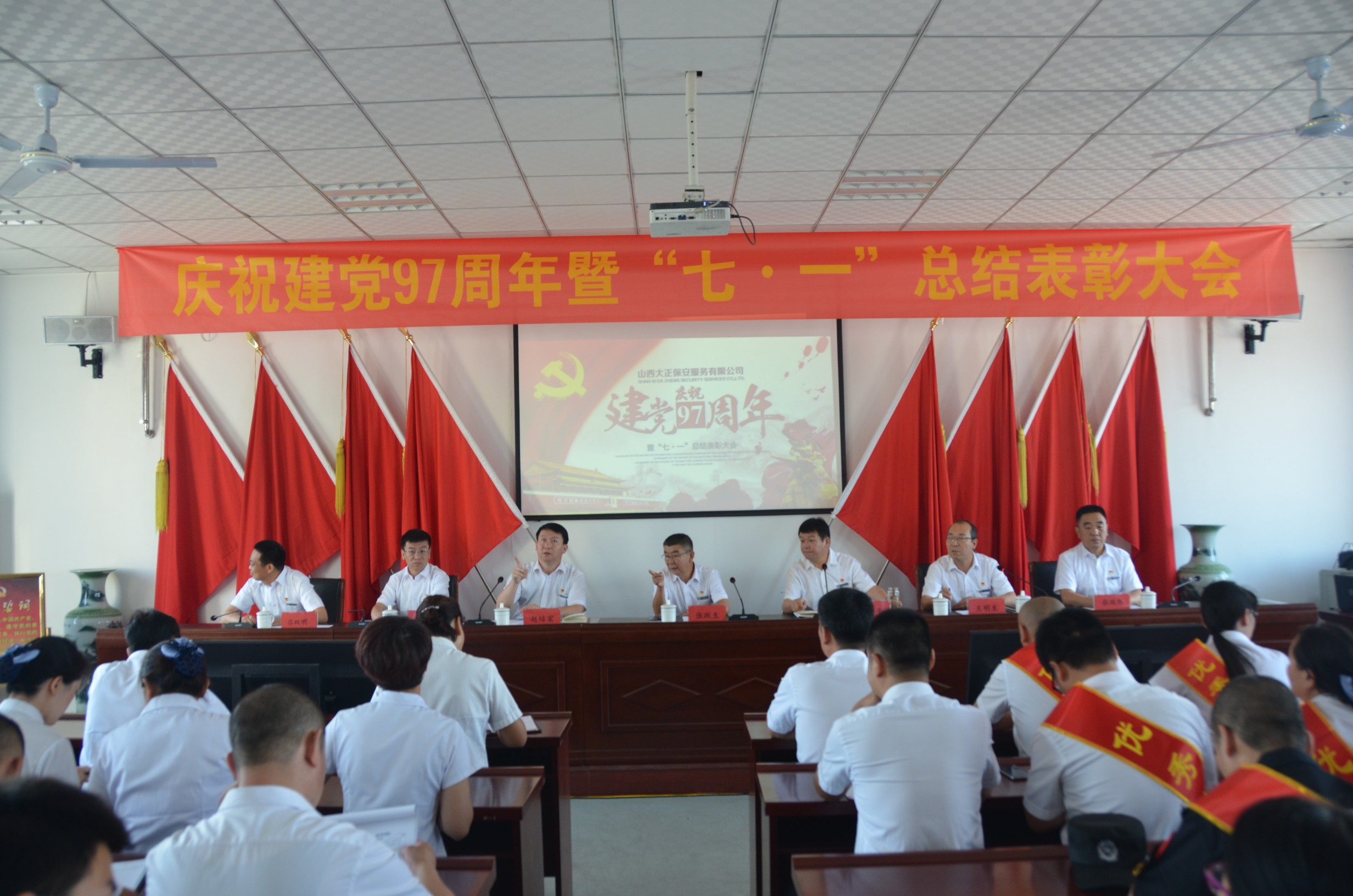 為慶祝建黨97周年,回顧總結(jié)公司一年來黨建及其它各項工作取得的新進展、新突破、新成果,安排部署下一階段黨建及其它各項工作,6月30日上午9時,山西大正保安服務(wù)有限公司在總公司會議室隆重召開了“慶祝建黨97周年暨“七·一”總結(jié)表彰大會”。總公司各部門、各分公司、各縣、市、區(qū)基層中隊分別在主會場、分會場收聽、收看了大會實況。出席大會的領(lǐng)導(dǎo)有張躍生、陳志平、趙培宏、王雙明、邢春生、張瑞東、呂雙明,大會由王明生同志主持。