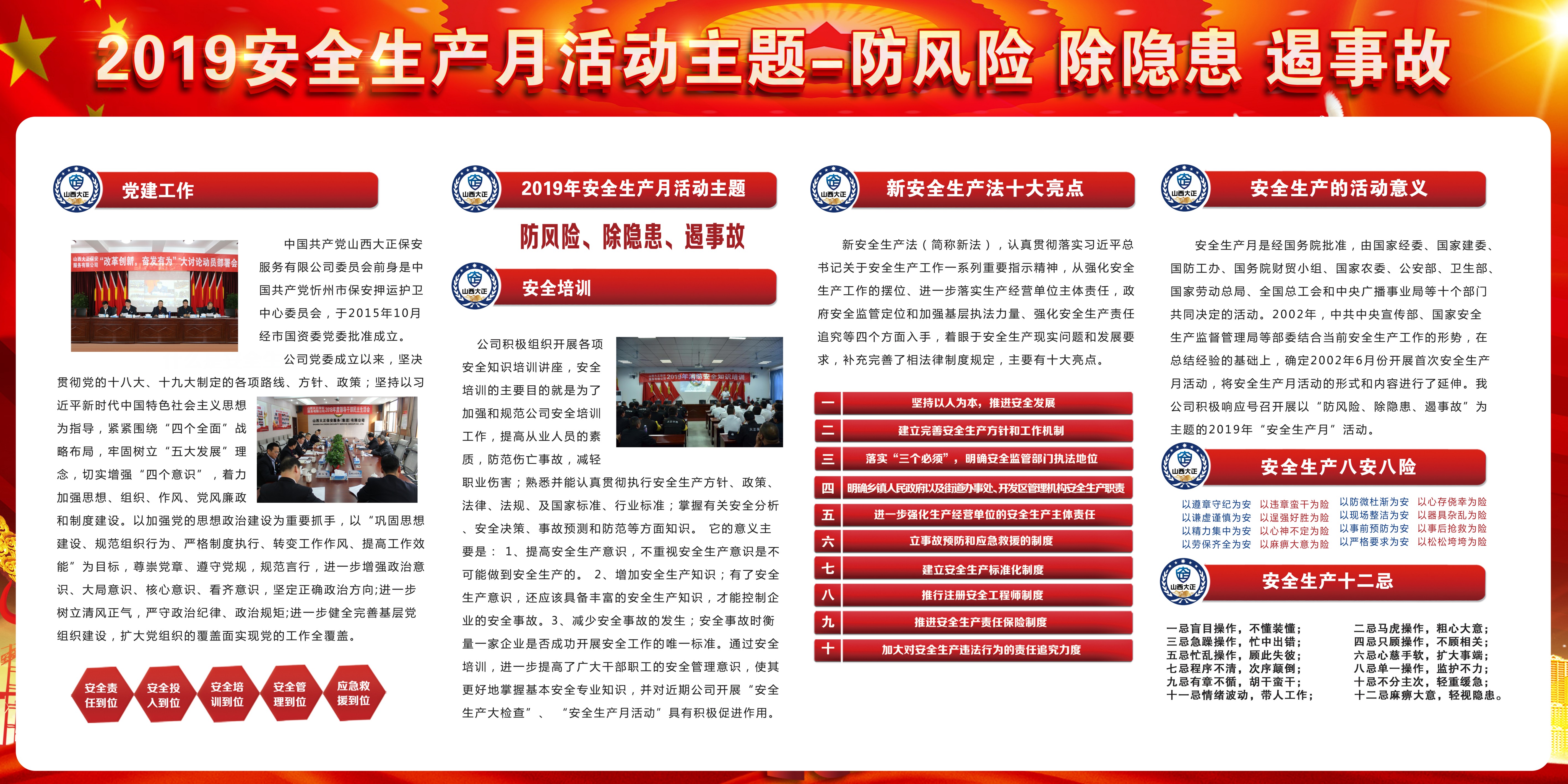 根據(jù)省政府安委辦、市政府安委辦要求,公司專門制定實(shí)施方案,周密組織開展以“防風(fēng)險、除隱患、遏事故”為主題的2019年我公司第18個“安全生產(chǎn)月”活動。
