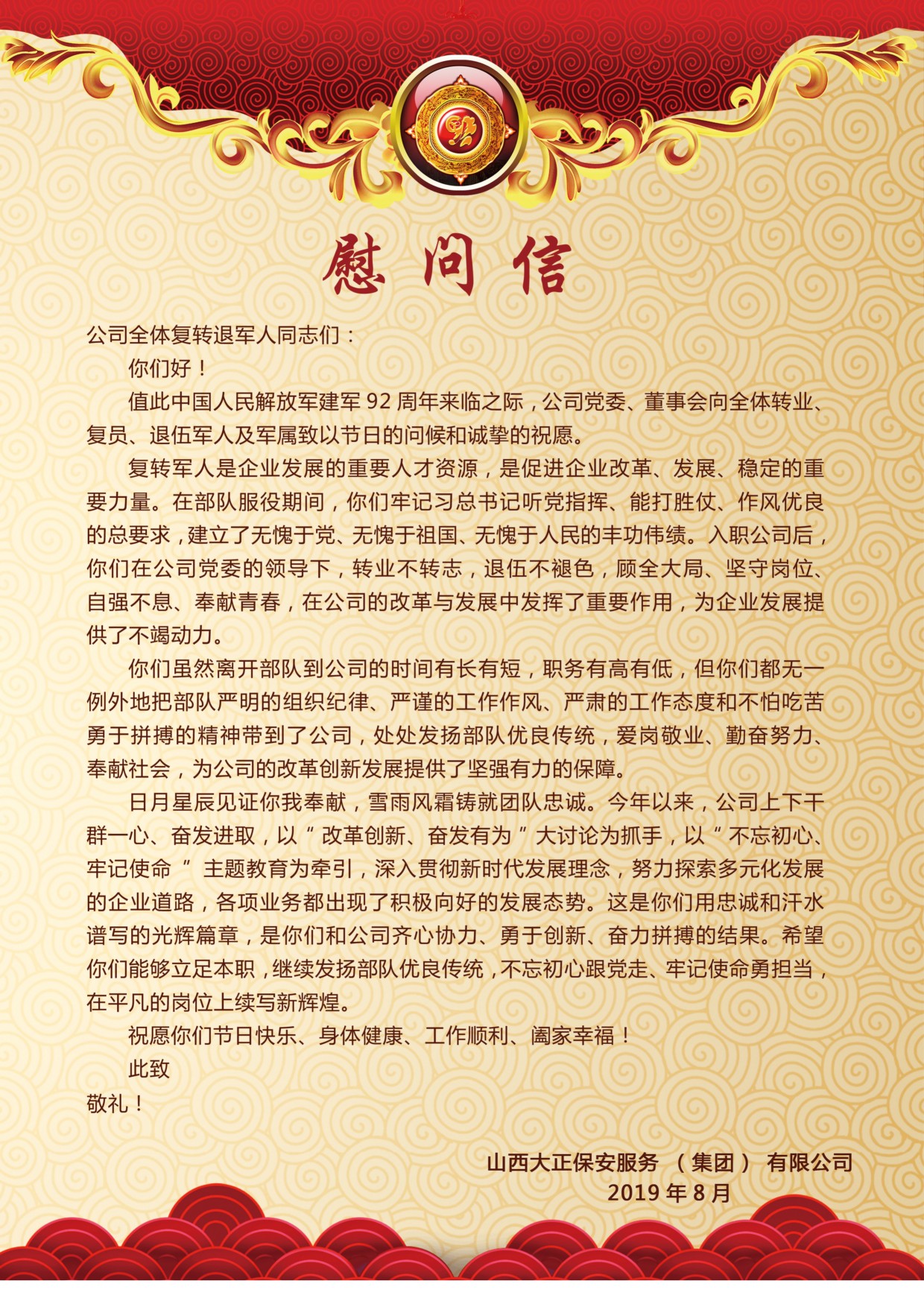 黨委委員、副總經(jīng)理趙培宏宣讀《慰問信》,信中談到:公司的每位復(fù)轉(zhuǎn)軍人都是企業(yè)發(fā)展的重要人才資源,是促進企業(yè)改革、發(fā)展、穩(wěn)定的重要力量,處處發(fā)揚著部隊優(yōu)良傳統(tǒng),為公司的改革創(chuàng)新發(fā)展提供了堅強有力的保障。希望大家能夠以“改革創(chuàng)新、奮發(fā)有為”大討論為抓手,以“不忘初心、牢記使命”主題教育為牽引,立足本職,發(fā)揚部隊優(yōu)良傳統(tǒng),不忘初心跟黨走、牢記使命勇?lián),在平凡的崗位上續(xù)寫新輝煌。