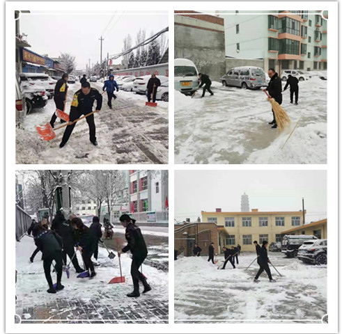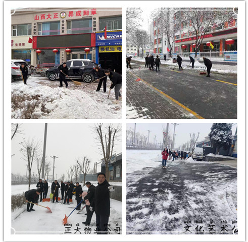 本次活動(dòng),利用1月6日—7日兩天時(shí)間,我公司組織全體員工清掃了位于開發(fā)區(qū)、七一南路、逯家莊、氣象北巷、通崗路等處城區(qū)駐地以及分布各縣的基層駐地的院內(nèi)積雪。我公司派駐各單位的保安、物業(yè)基層單位也積極行動(dòng),與服務(wù)單位的同志們一起清掃積雪,有力的保障了服務(wù)單位業(yè)務(wù)正常運(yùn)行。同時(shí),進(jìn)一步延伸清掃范圍,將九原東街北同蒲鐵路線附近,利民西街北九巷附近,七一路小學(xué)及十一中兩所學(xué)校附近等處路面的積雪進(jìn)行徹底清掃,為附近群眾出行提供了便利。