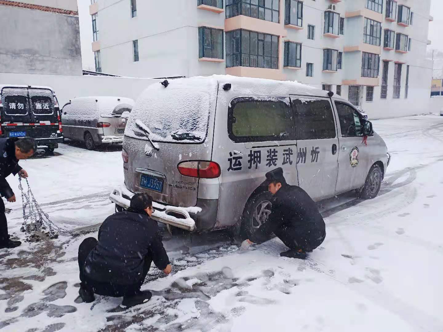 由于降雪天氣給運鈔車安全行駛導(dǎo)致安全隱患,中隊每日關(guān)注天氣情況有效應(yīng)對,及時安排各車組提前做好出車前車輛安全檢查以及安裝防滑鏈,同時囑咐要注意車速,確保行車安全。安全無小事,每一次往返任務(wù)都牽動著公司領(lǐng)導(dǎo)的心。由于天氣惡劣,車隊出發(fā)后,中隊管理人員一步不離堅守在崗位上,和各車組隨時保持著聯(lián)系,有時隊長、副隊長親自跟車,以便及時了解各車組途中的實際情況。