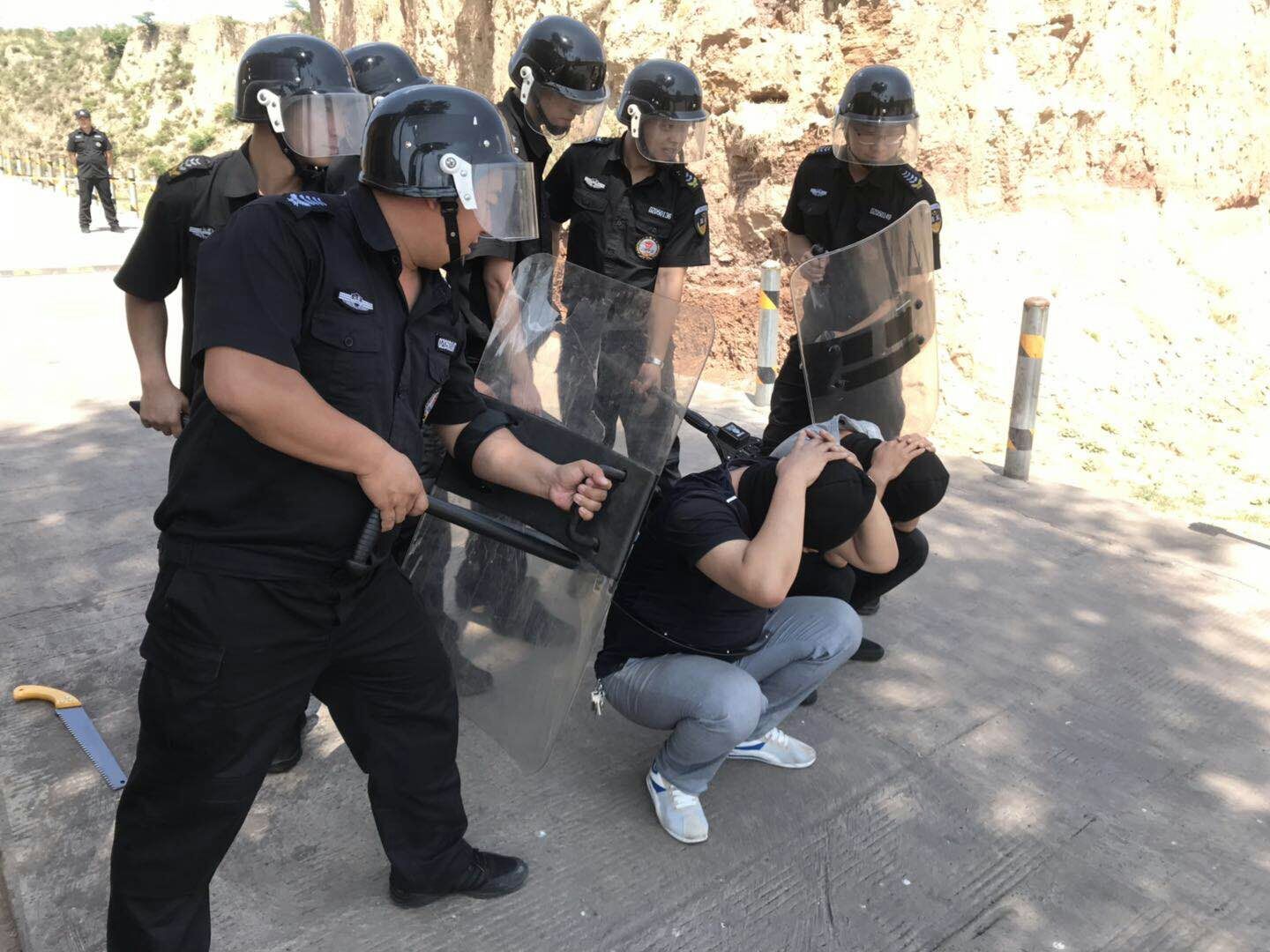 上午9時,接到炸藥庫值班人員的報警電話,稱有2名不明身份的人員手持兇器,靠近炸藥庫,隨即向服務單位領導報告此事。服務單位領導了解情況后立即下達啟動《炸藥庫應急救援預案》的命令,并做具體安排。9點30分左右,全體隊員在現場指揮員的命令下,裝備好防爆器械在辦公樓前整裝待發(fā)。所有隊員到達炸藥庫后,發(fā)現兩名歹徒在炸藥庫大門外準備沖擊炸藥庫,F場總指揮作安排,隊員分成三組實施抓捕。第一小組控制炸藥庫大門左邊通道,第二小組從炸藥庫圍墻迂回包抄,控制炸藥庫右邊通道,第三小組從炸藥庫正前方阻擊。在走投無路的重重包圍下,兩名歹徒棄械投降并被制服。隨后,現場人員向服務單位領導報告了現場情況,之后,迅速集結所有參戰(zhàn)人員聆聽總結評價。