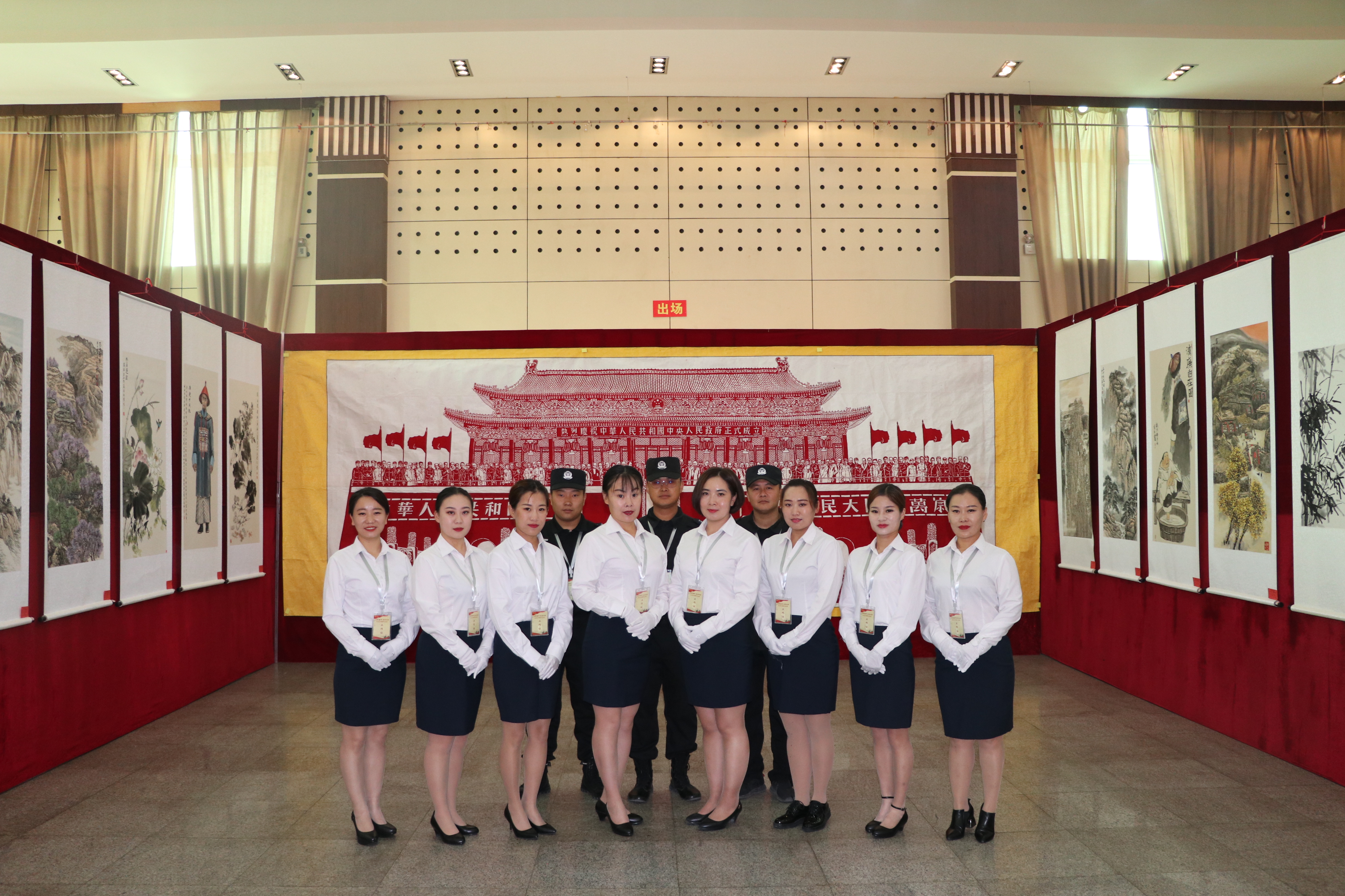 此次巡展意義非凡,文化藝術(shù)公司更是嚴陣以待。9月19號到黨校進行為期4天的會場布置,在男隊員外出勤務,隊里沒有男隊員的情況下,女隊員們充當搬卸工,實木的桌椅又大又沉,女隊員們喊著號子,堅持著硬是搬了200余張桌子,千余把椅子,四天里搬桌椅協(xié)助男隊員搭桁架,掛展出的作品,隨處都有女隊員的身影。巡展現(xiàn)場,8名女隊員負責禮儀引導,微笑服務,在場的領(lǐng)導紛紛為我們的女隊員豎起大拇指。